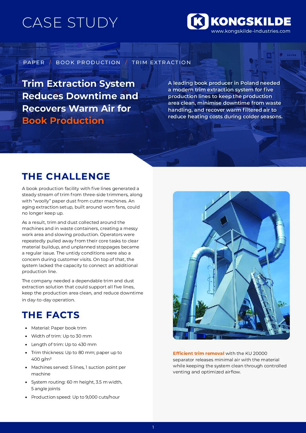 - La solution Kongskilde comprend : La tuyauterie, un ventilateur principal (MTK 55), un séparateur statique (KU 20000), un filtre à cartouche (DS 28), un ventilateur supplémentaire (MCD 50) et le panneau de commande qui contrôle tout le système de manière intuitive et automatique.
